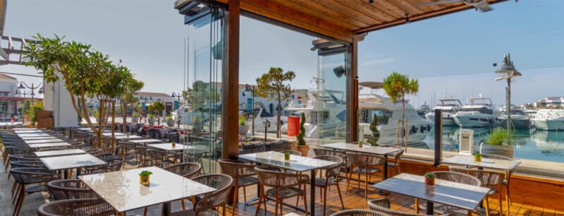 Well away from the noise and disorder of any vehicle traffic, you sit within a safe haven where the only sounds are muted exclamations over the exceptional quality of the food and drink, and the low-decibel selection of cool jazz that never assaults the senses but provides an additional element of genteel sophistication. In front of you, separated by a stretch of promenade, elegant white yachts float recumbent within their individual berths. Well-trained wait staff seat you, take your order and serve you with unobtrusive professionalism. Finally, all is right with the world as you sit back, relax and calmly converse with friends or loved ones over coffee, drinks or a bottle of excellent wine.